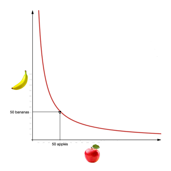 The important thing to realize is that Uniswap cannot deviate from this pricing curve. If someone wants to buy some apples and later someone else wants to buy some bananas, Uniswap will sweep back and forth through this pricing curve, wherever demand carries it.