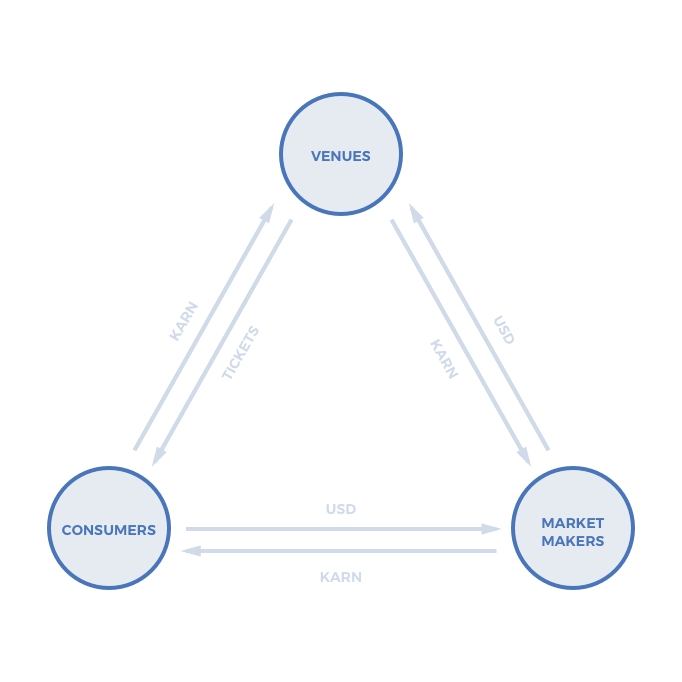 Venues also don’t have an incentive to hold Karn tokens because they, too, want to avoid price risk. After consumers trade their tokens for concert tickets, venue hosts will trade Karn tokens for their preferred currency. Note that this cycle can be completed in seconds by leveraging decentralized exchanges such as 0x: