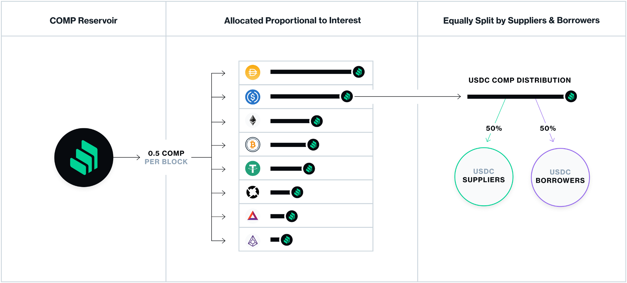For the next 4 years, Compound is offering “liquidity mining” for liquidity providers. This means that anyone that borrows or supplies assets on Compound in this span will be rewarded with a proportional allocation of COMP, of which 2,880 are distributed daily.