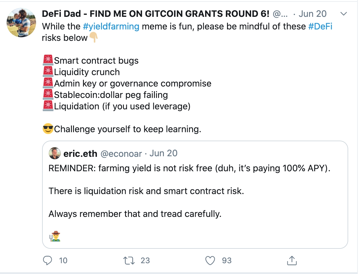 Yield farming has exploded onto the DeFi scene and captured peoples’ imaginations, and the fervor at hand makes it easy to envision this exciting meme going on to attract people to Ethereum for years to come. But remember: it’s not all fun and games, either. As Ethereum stalwart Eric Conner recently put it, yield farming does have liquidation risks and smart contract risks, and as such you should never farm with money you’re not willing to lose while things are still early.