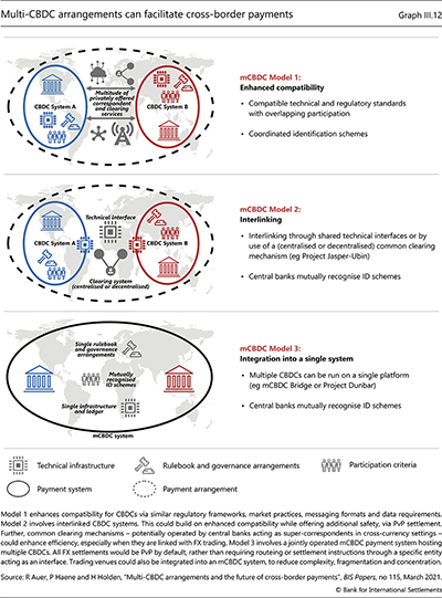 mCBDC arrangements would allow central banks to mitigate many of today's frictions by starting from a "clean slate", unburdened by legacy arrangements. There are three potential models. First, they could enhance compatibility for CBDCs via similar regulatory frameworks, market practices and messaging formats (Graph III.12, top panel). Second, they could interlink CBDC systems (middle panel), for example via technical interfaces that process end user-to-end user transactions across currency areas without going through any middlemen.