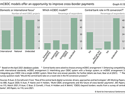 A broader stocktake of central bank research and design efforts finds that, out of 47 public retail CBDC projects, 11 feature a cross-border dimension (Graph III.13, left-hand panel). Responses to a survey of major central banks highlight that about one in four is considering incorporating features to enhance cross-border and cross-currency settlement in future CBDC designs (centre panel). Among the central banks that do, all three mCBDC arrangements are being considered. While a single mCBDC (model 3) provides the most benefits from a technological perspective, the preferred choice at present is the interlinking mCBDC arrangement (model 2) – possibly reflecting the reduced need for cooperation. Additionally, some central banks are also considering taking on an operational role in FX conversion (right-hand panel).
