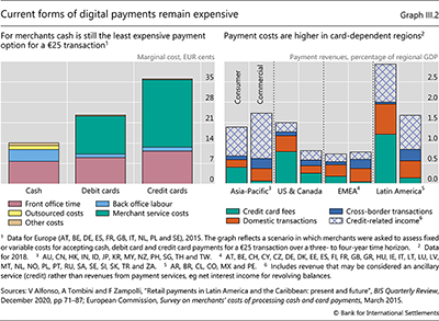 Entrenchment of market power may potentially exacerbate the high costs of payment services, still one of the most stubborn shortcomings of the existing payment system. An example is the high merchant fees associated with credit and debit card payments. Despite decades of ever-accelerating technological progress, which has drastically reduced the price of communication equipment and bandwidth, the cost of conventional digital payment options such as credit and debit cards remains high, and still exceeds that of cash (Graph III.2, left-hand panel). In some regions, revenues deriving from credit card fees are more than 1% of GDP (right-hand panel).