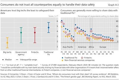 The availability of massive amounts of user data gives rise to another important issue – that of data governance. Access to data confers competitive advantages that may entrench market power. Beyond the economic consequences, ensuring privacy against unjustified intrusion by both commercial and government actors has the attributes of a basic right. For these reasons, the issue of data governance has emerged as a key public policy concern. When US consumers were asked in a representative survey whom they trust with safeguarding their personal data, the respondents reported that they trust big techs the least (Graph III.3, left-hand panel). They have far more trust in traditional financial institutions, followed by government agencies and fintechs. Similar patterns are present in other countries (right-hand panel). The survey reveals a number of concerns, but the potential for abuse of data emerges as an important element. A later section of this chapter discusses data governance issues more fully.
