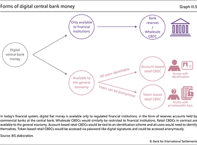 Retail CBDCs come in two variants (Graph III.5). One option makes for a cash-like design, allowing for so-called token-based access and anonymity in payments. This option would give individual users access to the CBDC based on a password-like digital signature using private-public key cryptography, without requiring personal identification. The other approach is built on verifying users' identity ("account-based access") and would be rooted in a digital identity scheme.15 This second approach is more compatible with the monitoring of illicit activity in a payment system, and would not rule out preserving privacy: personal transaction data could be shielded from commercial parties and even from public authorities by appropriately designing the payment authentication process. These issues are intimately tied to broader policy debates on data governance and privacy, which we return to in a later section.