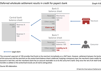 Although CBDCs and FPS have many characteristics in common, one difference is that CBDCs extend the unique features and benefits of today's digital central bank money directly to the general public.17 In a CBDC, a payment only involves transferring a direct claim on the central bank from one end user to another. Funds do not pass over the balance sheet of an intermediary, and transactions are settled directly in central bank money, on the central bank's balance sheet and in real time. By contrast, in an FPS the retail payee receives final funds immediately, but the underlying wholesale settlement between PSPs may be deferred.18 This delay implies a short-term loan between parties, together with underlying credit risk on those exposures (Graph III.6): the payee's bank credits its account in real time, while it has an account payable vis-à-vis the payer's bank. In an FPS with deferred settlement, credit exposures between banks accumulate during the delay, for example over weekends. This exposure may be fully or partially collateralised – an institutional safeguard designed by the central bank.