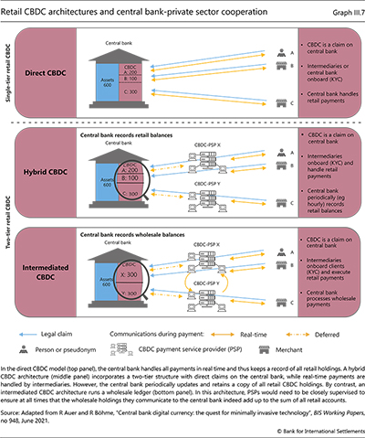 One possibility is an operational architecture in which the private sector onboards all clients, is responsible for enforcing AML/CFT regulations and ongoing due diligence, and conducts all retail payments in real time. However, the central bank also records retail balances. This "hybrid" CBDC architecture (Graph III.7, centre panel) allows the central bank to act as a backstop to the payment system. Should a PSP fail, the central bank has the necessary information – the balances of the PSP's clients – allowing it to substitute for the PSP and guarantee a working payment system. The e-CNY, the CBDC issued by the People's Bank of China and currently in a trial phase, exemplifies such a hybrid design.23