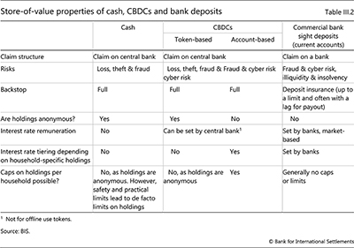 Central banks have ample scope to ensure the smooth functioning of intermediation activities and possess the tools to achieve this objective (Table III.2). One option is to remunerate CBDC holdings at a lower interest rate than that on commercial bank deposits.27 Just as cash holdings offer no remuneration, a central bank could pay zero interest, or in principle a negative interest rate. For CBDCs tied to an identity scheme (ie account-based CBDCs), any potential encroachment on private intermediaries could be further mitigated via caps that restrict the amount of CBDC held by households and businesses. Another option might combine caps and an interest rate policy, with CBDC balances below a given level earning a zero or low interest rate and balances above that level earning a negative interest rate. One caveat with hard caps is that households or firms that have reached their cap could not accept incoming payments, resulting in a broken payment process. To ensure that households and firms can accept incoming payments at all times, any funds in excess of a cap could be transferred automatically to a linked commercial bank deposit account – the so-called overflow approach.28 Caps, overflows and remuneration policies would not only limit the impact of a CBDC on credit intermediation in normal times, but they could also mitigate potential runs into the CBDC during market turmoil. Central banks might devise various ways of deterring "digital runs" from commercial banks to CBDCs in times of stress.29
