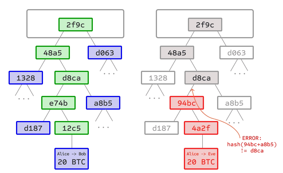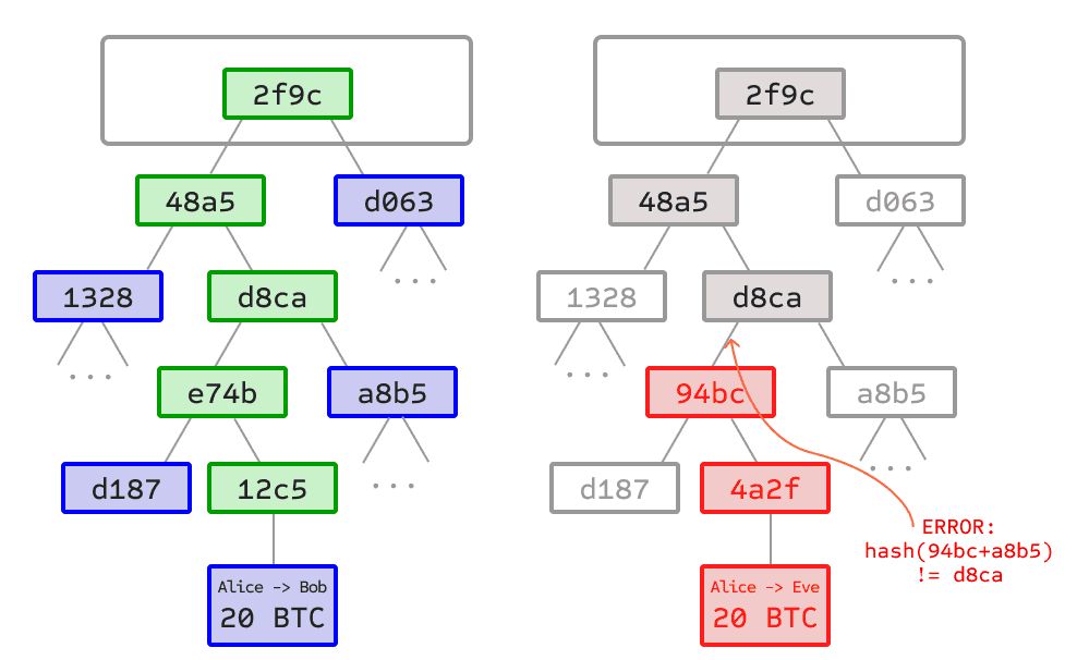 Left: it suffices to present only a small number of nodes in a Merkle tree to give a proof of the validity of a branch.