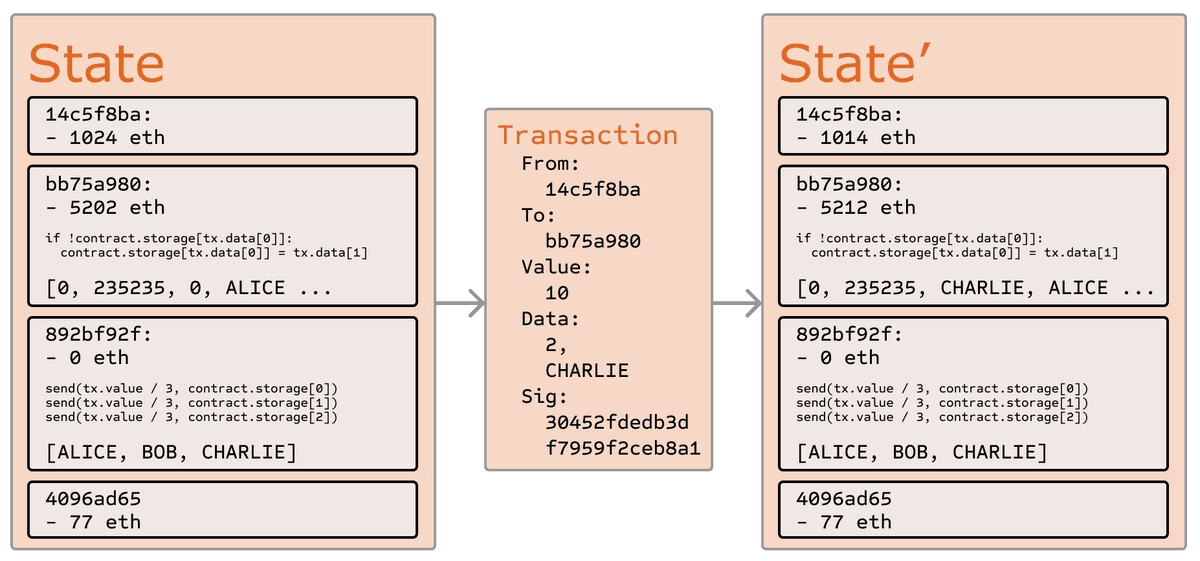The state transition function APPLY(S,TX) -> S' can be defined roughly as follows:
