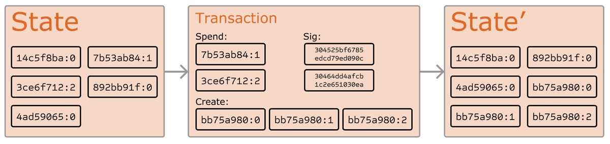 APPLY({ Alice: $50, Bob: $50 },"send $70 from Alice to Bob") = ERRORThe "state" in Bitcoin is the collection of all coins (technically, "unspent transaction outputs" or UTXO) that have been minted and not yet spent, with each UTXO having a denomination and an owner (defined by a 20-byte address which is essentially a cryptographic public keyfn1). A transaction contains one or more inputs, with each input containing a reference to an existing UTXO and a cryptographic signature produced by the private key associated with the owner's address, and one or more outputs, with each output containing a new UTXO to be added to the state.