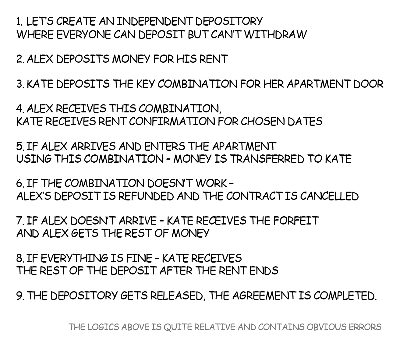 Alex cannot suddenly take his money from the virtual wallet. Kate can’t slip Alex with the wrong code or apartment address as then she doesn’t get anything.