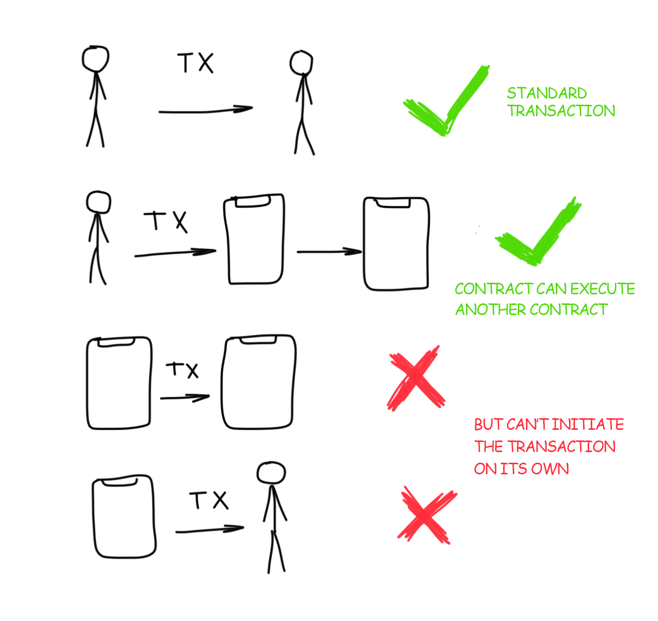 A traditional user wallet here is called “externally owned account” and created “contract account” in the network of smart contracts. In the following text, they’re called “wallet” and “contract”, for brevity.