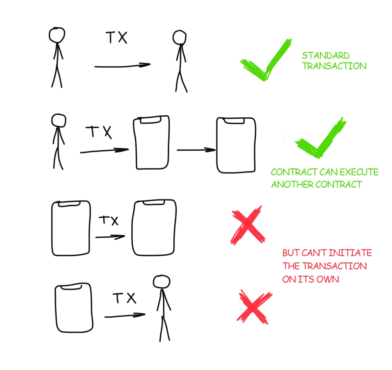 An important feature: timers that trigger on a certain time are impossible in contracts impossible timers. A contract can only be triggered by a transaction which is always launched by a live person. The contract does not work “in the background”. If it was called – it can well cause another contract.