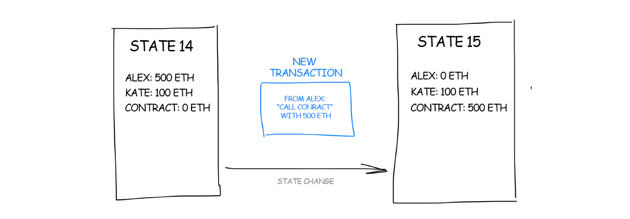 Each transaction writes changes to this repository (very similar to git commits). When Alex calls Kate’s contract, the transaction “Alex called Kate’s contract” is added to blockchain. “On the contract balance now 100 from Alex / on Alex’s balance N-100″ is “committed” to the storage. This is the new state after the changes.