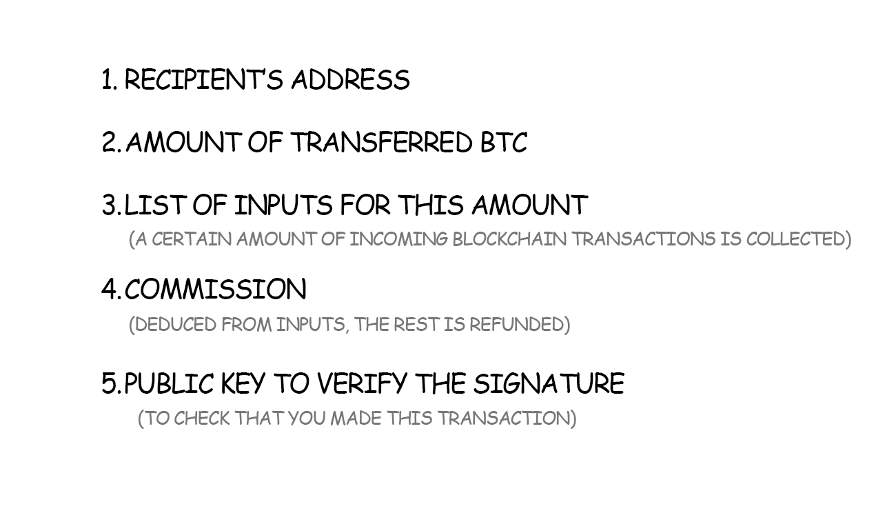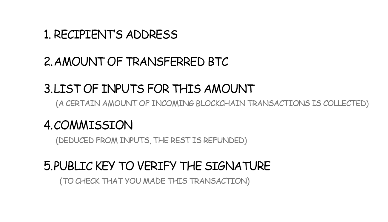 For the common man, the transaction in Bitcoin consists of five basic elements: