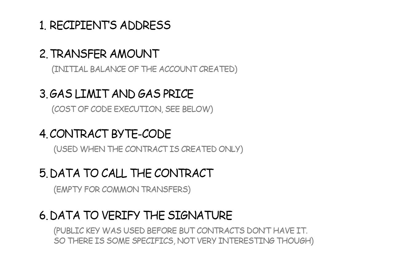 Here is the list of the main components of the transaction in Ethereum: