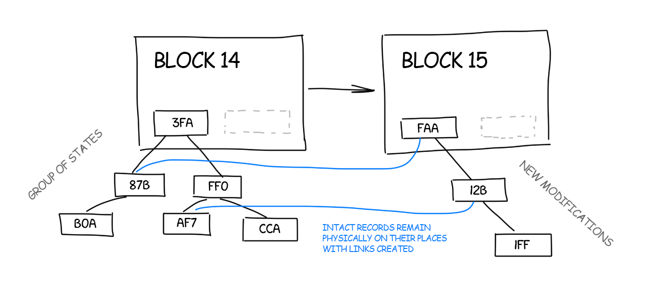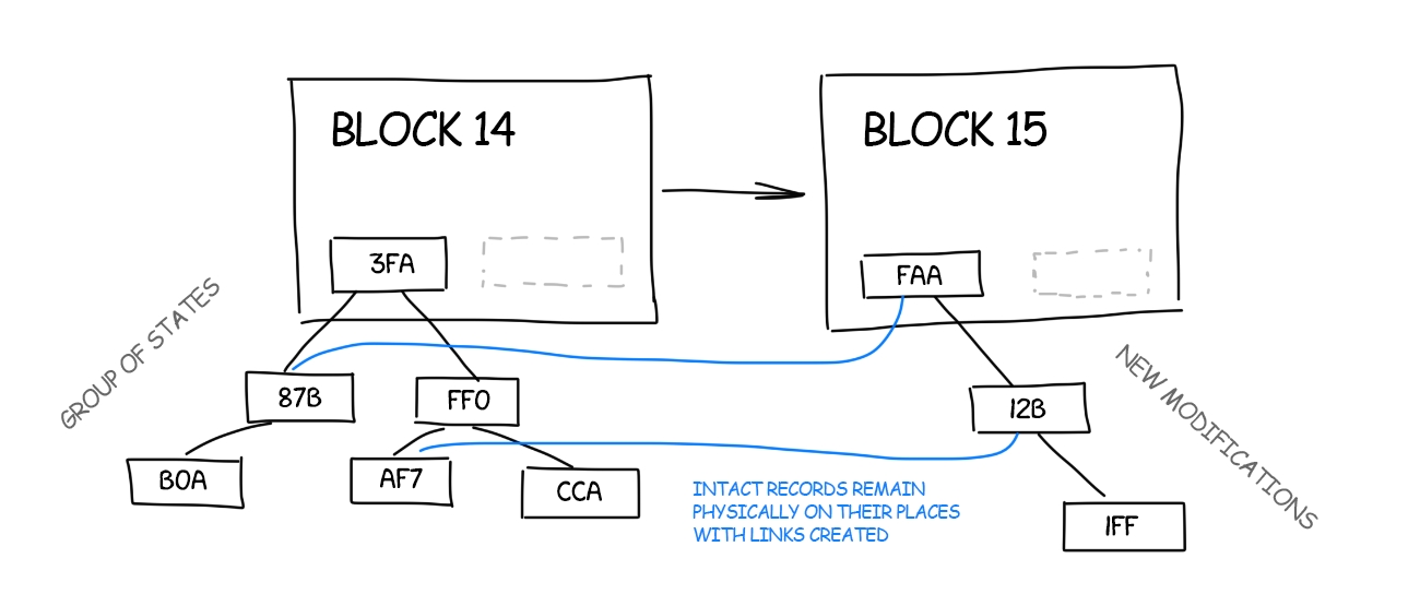 Hash of the storage becomes one of the most important components of the block. It is always included in every block found and gets verified by all network members so that no one tries to “forge” the state of the system. Merely the Merkle tree allows you to do this quickly: you only need to check the changed parts of the tree, the hashes of the others remain the same.