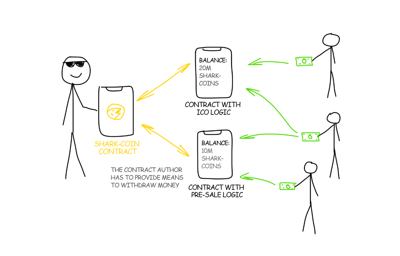 Here is a little hint for Alex – it can be resolved by the creation of a second smart contract – a sales contract. It has the whole logic of the ICO inside: the start and end dates, the initial price, the limitation of the number of tokens being sold and so on. Now investors will send money to this contract and it will decide how many shark-coins to give out to everyone and at what price.