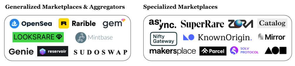 Marketplaces allow users to find buyers and sellers of NFTs via order books and simple sale or auction mechanisms. They can be generalized (Opensea, Rarible) or specialized (e.g. SuperRare for art, Catalog for music, Parcel for virtual land). Marketplaces command large order books of listings and bids and are the most intuitive way for users to buy and sell NFTs. However, without an active market of participants or PR/marketing efforts, the market ends up illiquid for the long tail of assets.