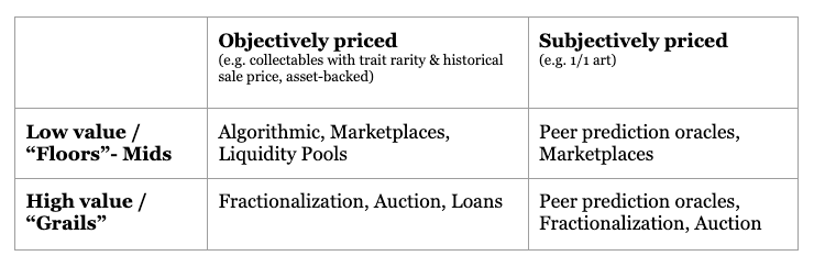 Summary of the above discussion. Mapping NFT price tiers to their most effective liquidity methods.