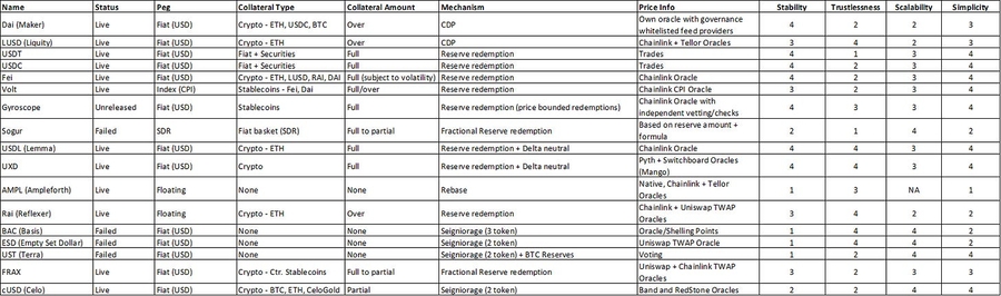 The scope of this evaluation, however is restricted to stability, trustlessness, scalability and simplicity as my primary objective is to conclude on what I believe is the most decentralized and scalable stablecoin design.