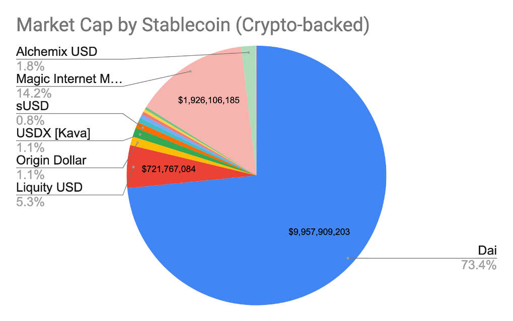 Total market cap of crypto-backed stablecoins currently stands at +$13 billion. Source: CoinMarketCap