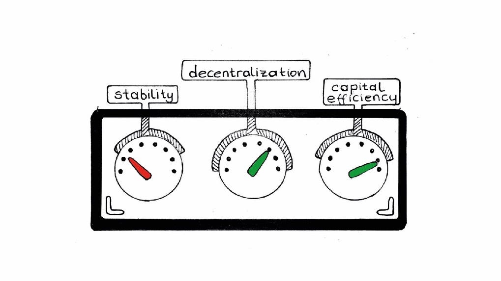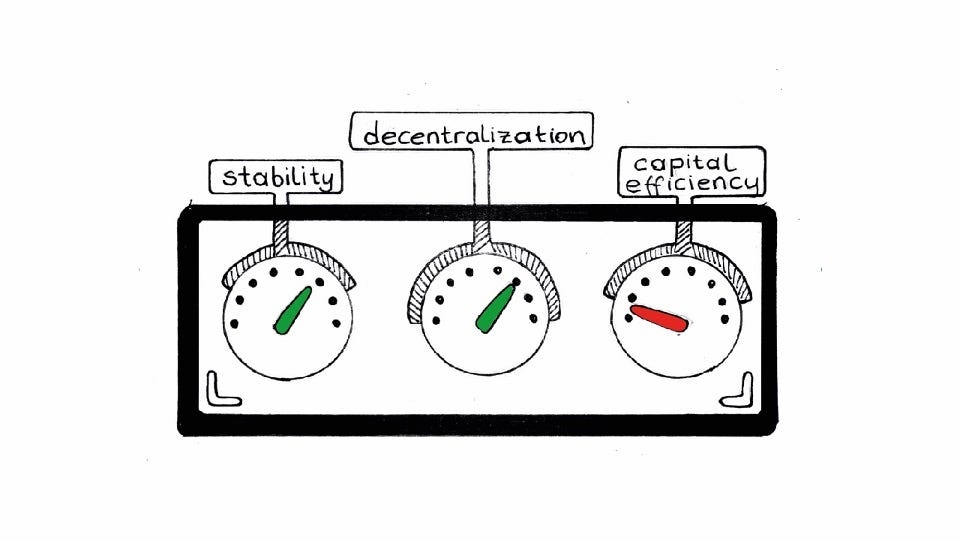 Mission control deck for crypto-backed stablecoins by diedamlas. High stability, high decentralization, low capital efficiency.