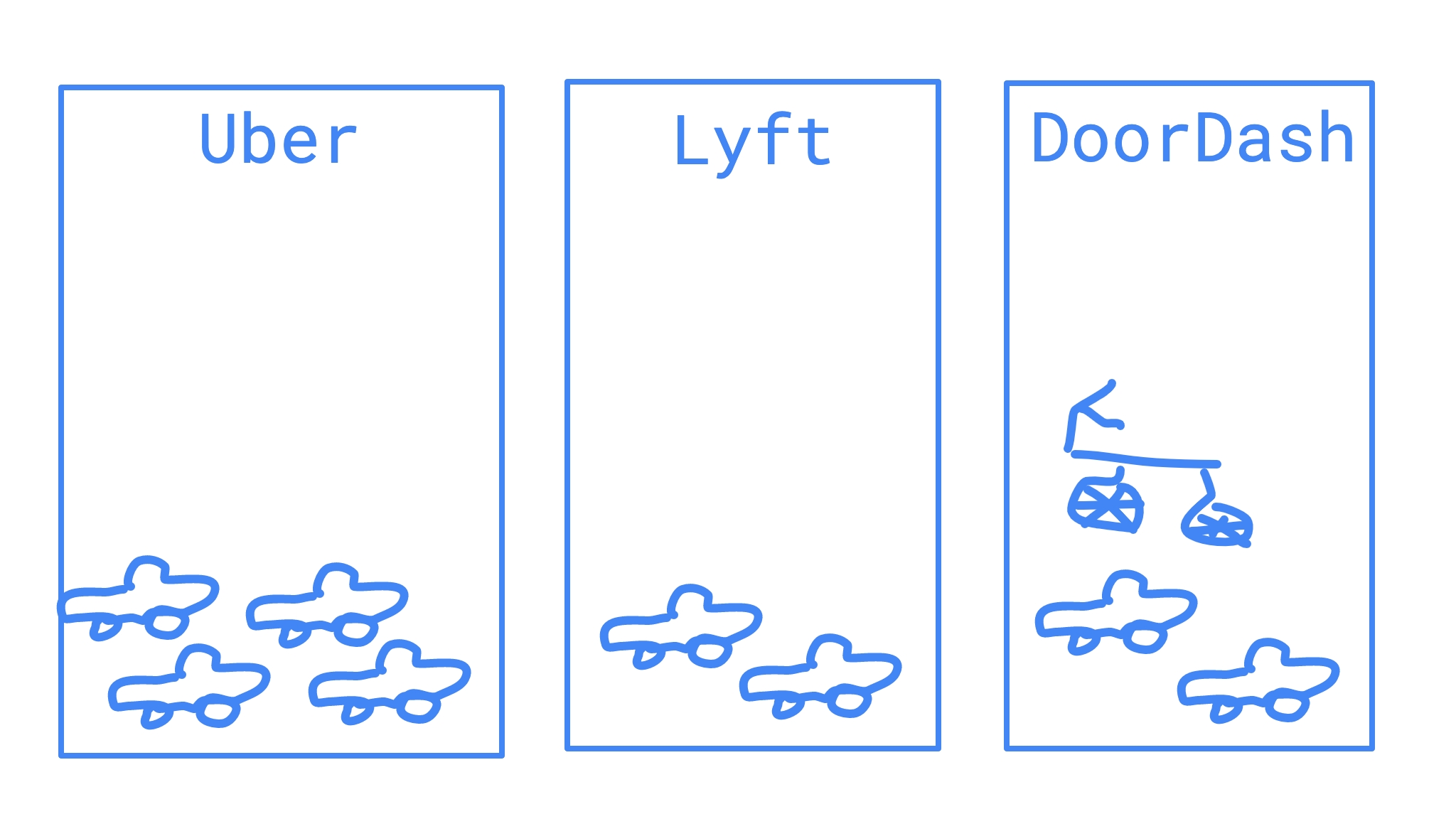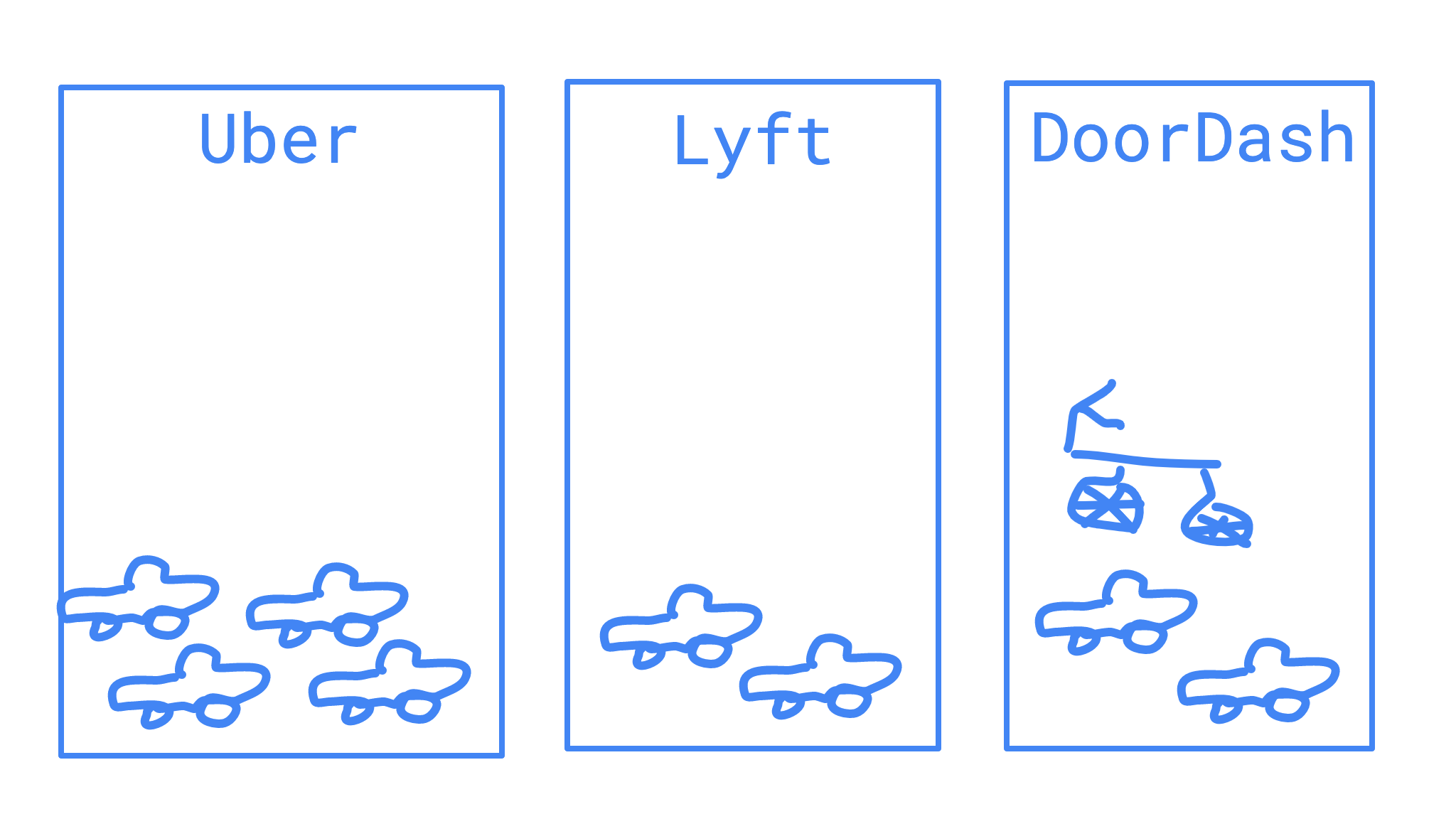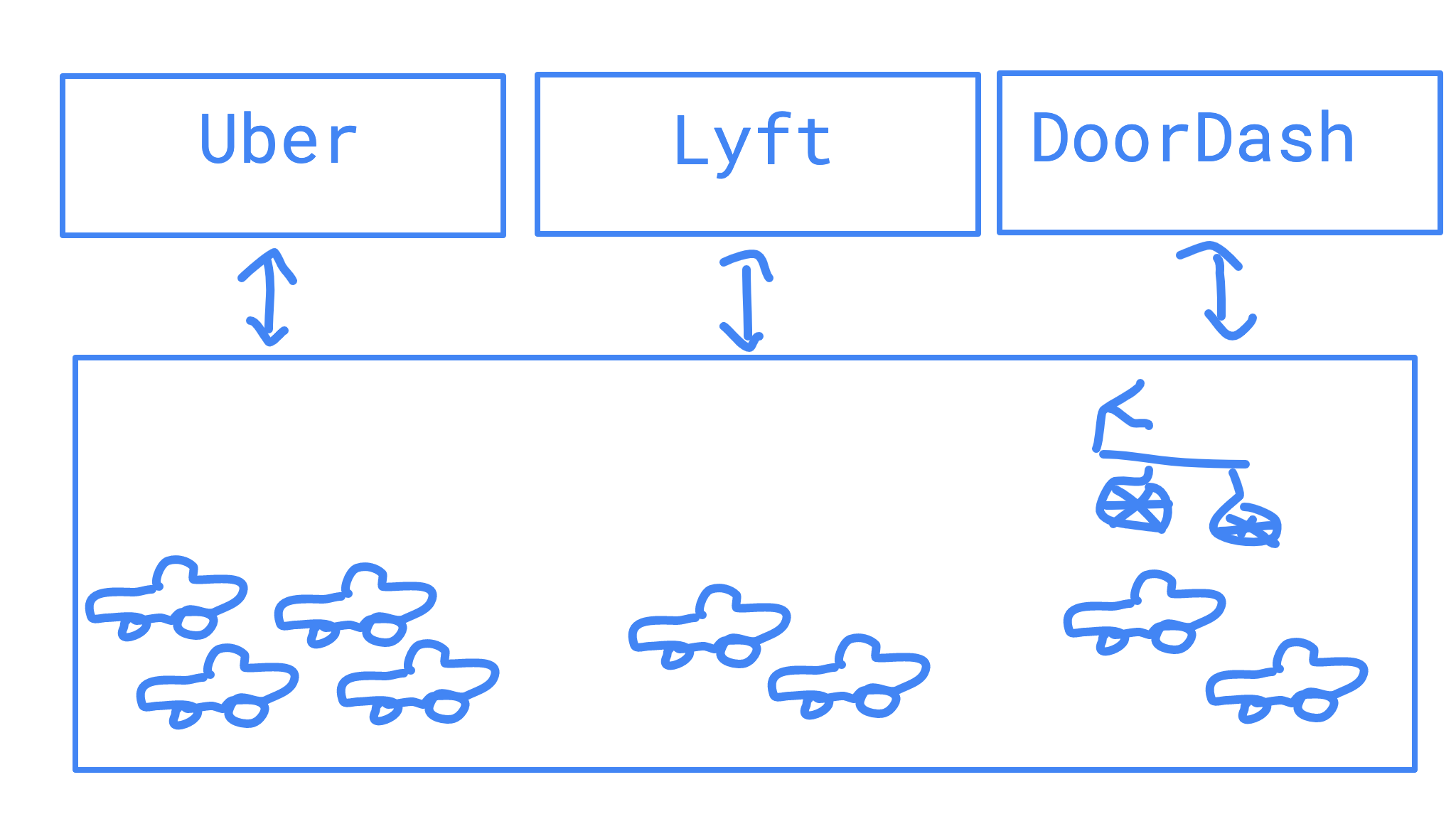 Zooming outside of software, imagine — instead of Uber and Lyft having separate drivers, and DoorDash and Postmates having separate delivery folk — there was a global pool of people going from point A to point B, and apps could place products that moved from A to B on this global pool of transportation, bidding for the best price.