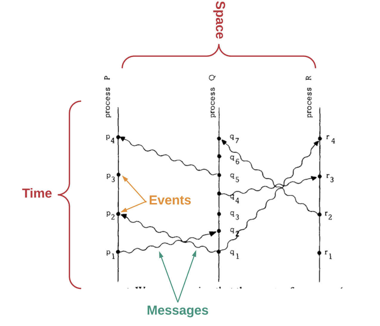 In the paper “Time, Clocks and Ordering of Events in a Distributed System,” Leslie Lamport shows how we can deduce whether one event happens before another by remembering the following factors: