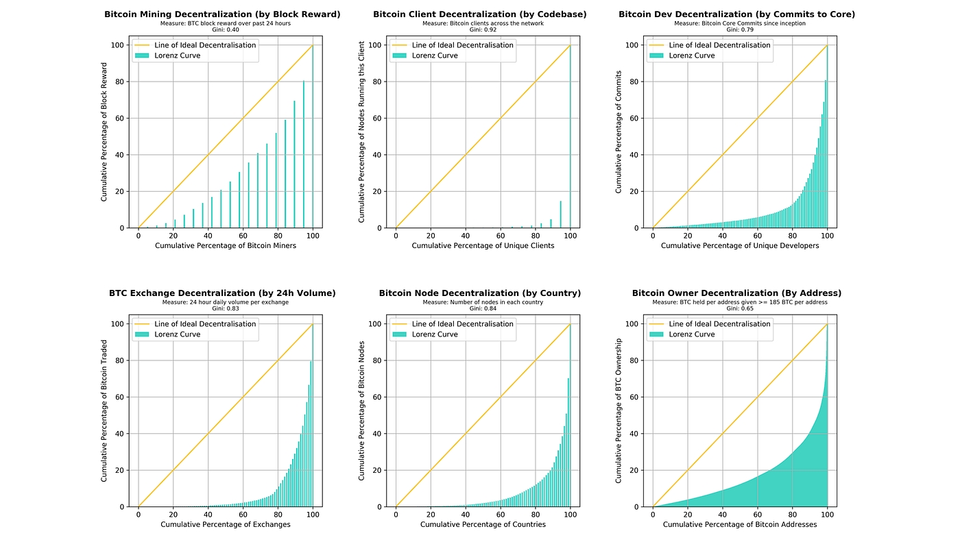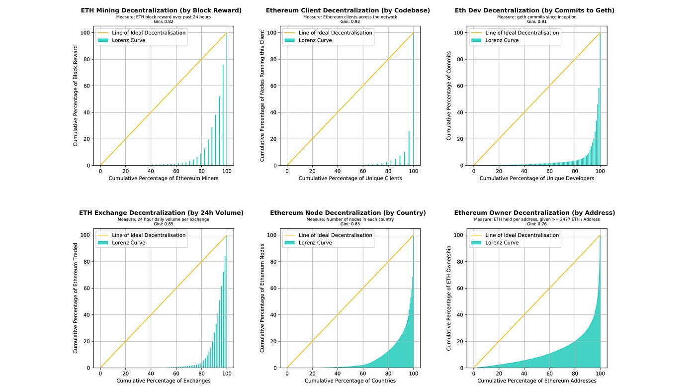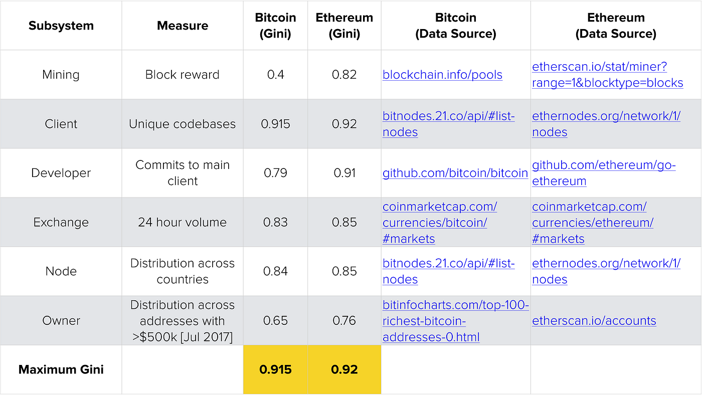 We certainly don’t argue that the particular choice of six subsystems here is the perfect one for measuring decentralization; we just wanted to gather some data to show what this kind of calculation would look like. We do argue that the maximum Gini coefficient metric starts to point in the right direction of identifying possible decentralization bottlenecks.