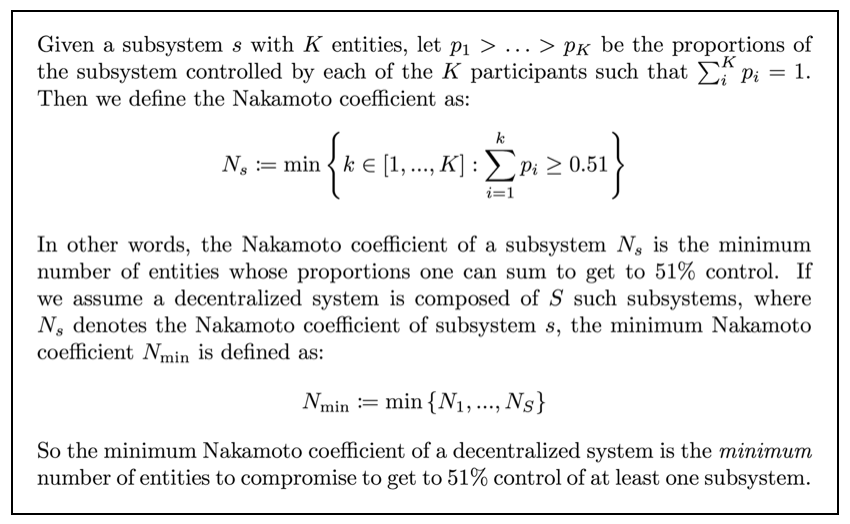 Many have said that decentralization is the most important property of systems like Bitcoin and Ethereum. If this is true, then it is critical to be able to quantify decentralization. The minimum Nakamoto coefficient is one such measure; as it increases, the minimum number of entities required to compromise the system increases. We believe this corresponds to the intuitive notion of decentralization.