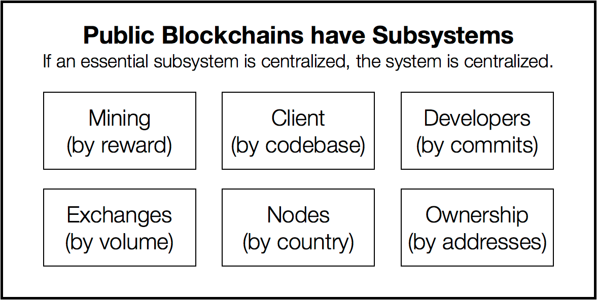 To apply this concept to the space of public blockchains, we need to make a distinction between a decentralized system and a decentralized subsystem. Specifically, a decentralized system (like Bitcoin) is composed of a set of decentralized subsystems (like mining, exchanges, nodes, developers, clients, and so on). Here are six of the subsystems that compose Bitcoin: