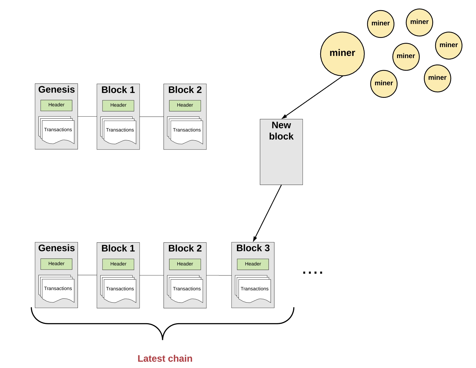 The first miner to solve the algorithm adds the proof and the new block (and all the transactions in it) to the blockchain and broadcasts it to the network. At that point, everyone else in the network syncs the latest blockchain because it’s a “truth” everyone believes in.