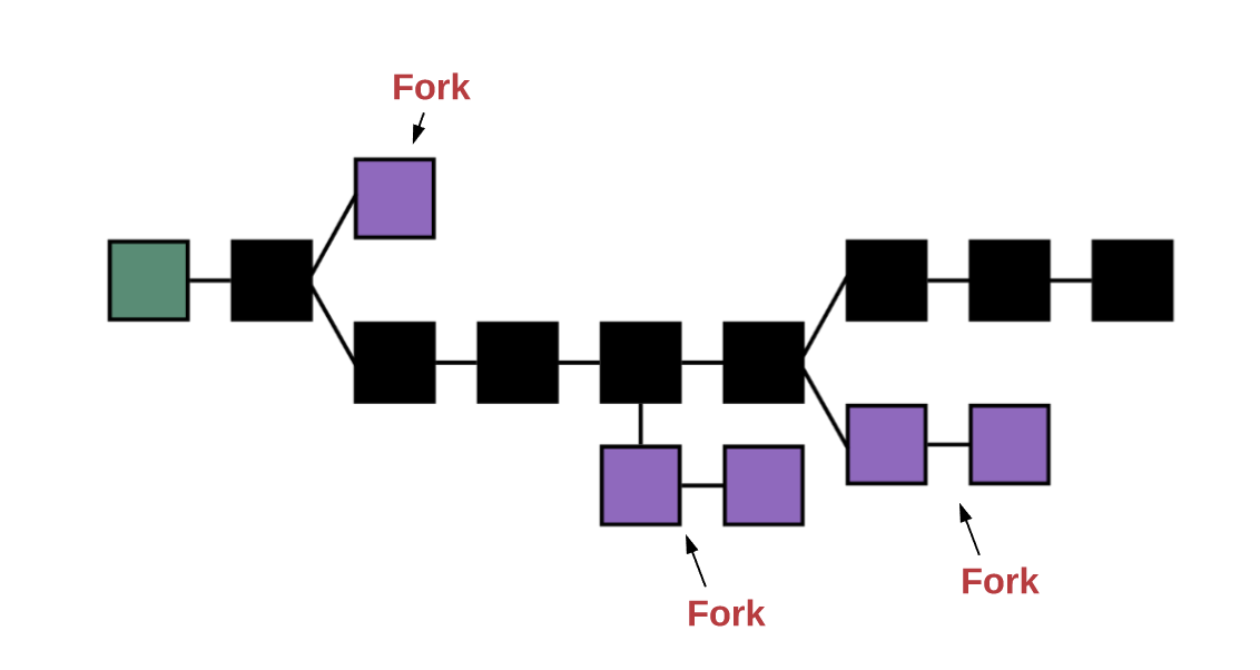 Since miners are competing to run computations, there are times when multiple blocks get solved at the same time. This then creates a “fork” of multiple chains:
