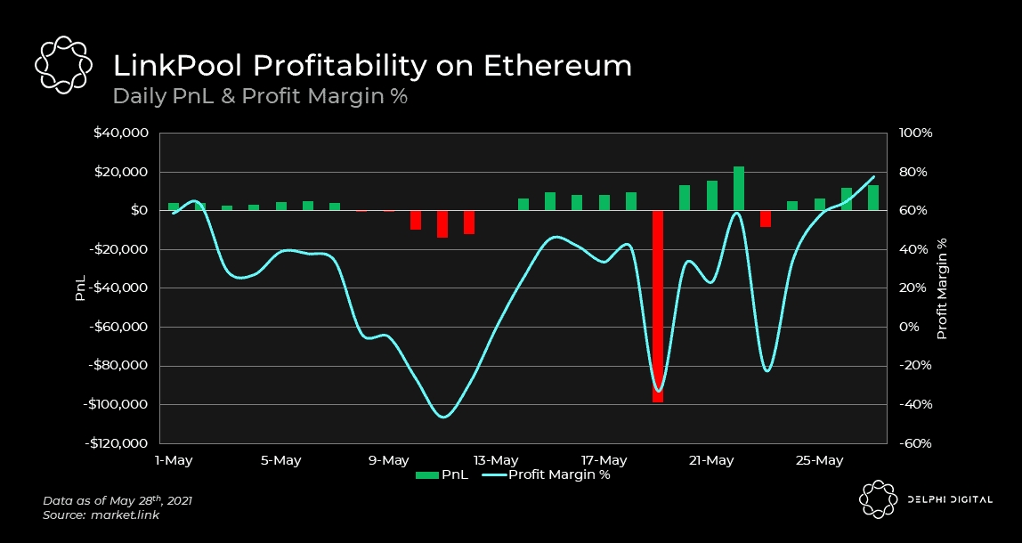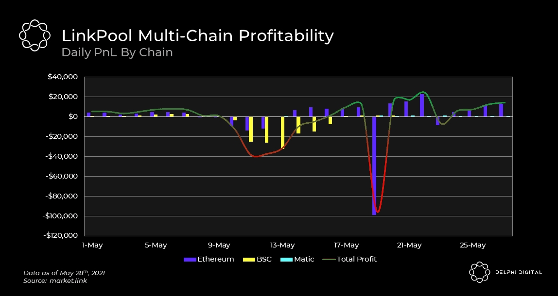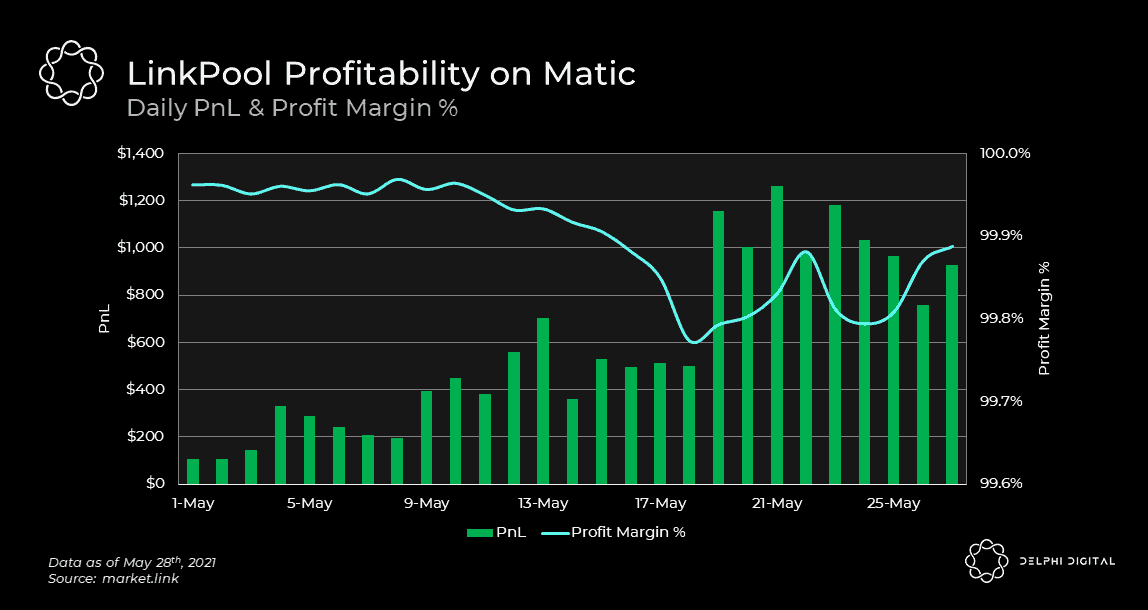 In the chart below, we’ve plotted the multi-chain profitability of LinkPool, a top Chainlink node, over the course of May using data from Chainlink Market. As you can see, total profitability ebbed and flowed materially at certain points in May. The days that sharply turned unprofitable all of the sudden occurred when gas fees spiked on the chains supported by LinkPool.