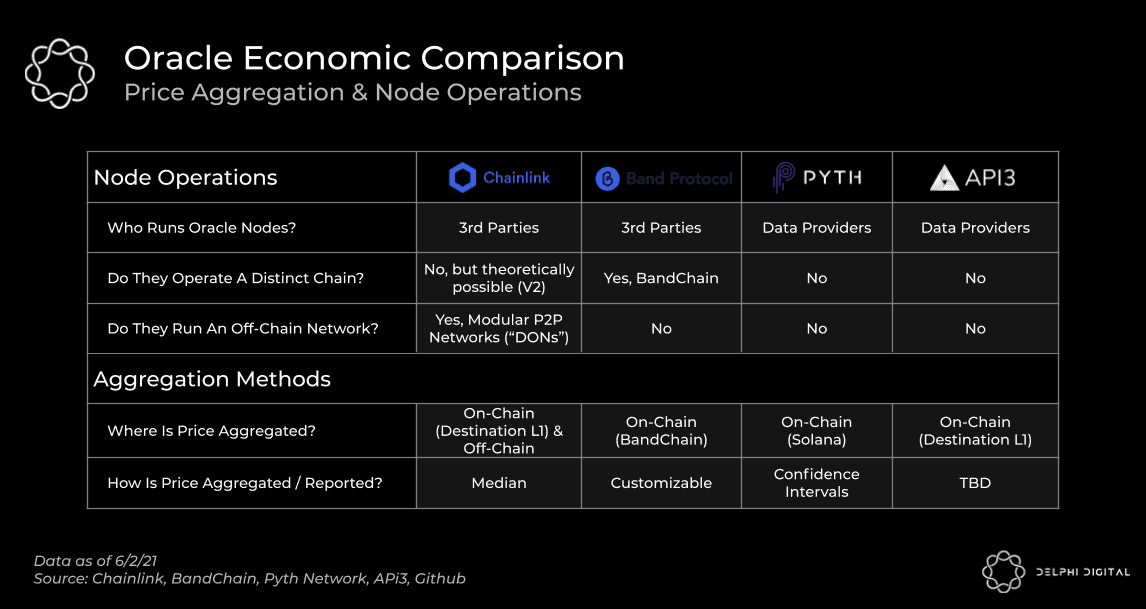 Staking, in one form or another, is likely necessary though, if for no other reason than to align incentives and make the oracle solution more sybil-resistant. Will the staked value be enough to truly secure the data feeds? After much debate between members of our team, we’re not sure if attaining that is feasible, or even economically viable. In the absence of it, we believe that reputation will be vital to security, perhaps moreso for oracles than any other sector in crypto. With this in mind, one aspect we like about Pyth and API3 is that the data providers themselves are the ones placing their reputation on the line. If prominent firms participate, it will go a long way to improving the trust consumers place in their oracles relative to the third-party operators seen in Chainlink and Band Protocol. Furthermore, the fact that the majority of Chainlink nodes are completely anonymous is less than ideal. However, Chainlink’s DECO and Town Crier solutions, as outlined in the V2 whitepaper, could allow third-party node operators to prove that they haven’t tampered with the data they received from its source.