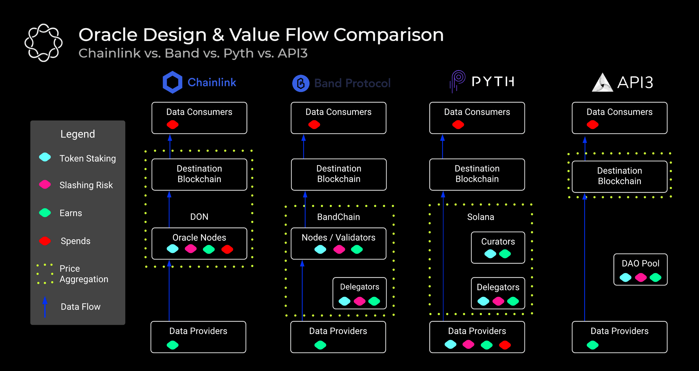 Let’s start by reviewing the diagram below, where we’ve created an abstract yet simplified view of each oracle relative to one another. While this diagram may look a bit different from what you’ll typically see in each protocol’s documentation, we’ve structured it this way to communicate a few key ideas -1) who are the stakeholders, 2) what are the economic underpinnings and 3) how does everything functions at a network level.