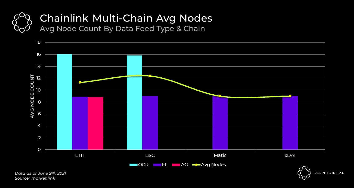 Chainlink is often touted as having hundreds of oracle nodes. While certainly true, only a small subset of the total nodes support each individual data feed and chain. For example, if we look at the chart below, the average number of nodes ranges from 9-12 depending on the chain. The implications of this will be important to consider when we reach the staking section later on in this report.